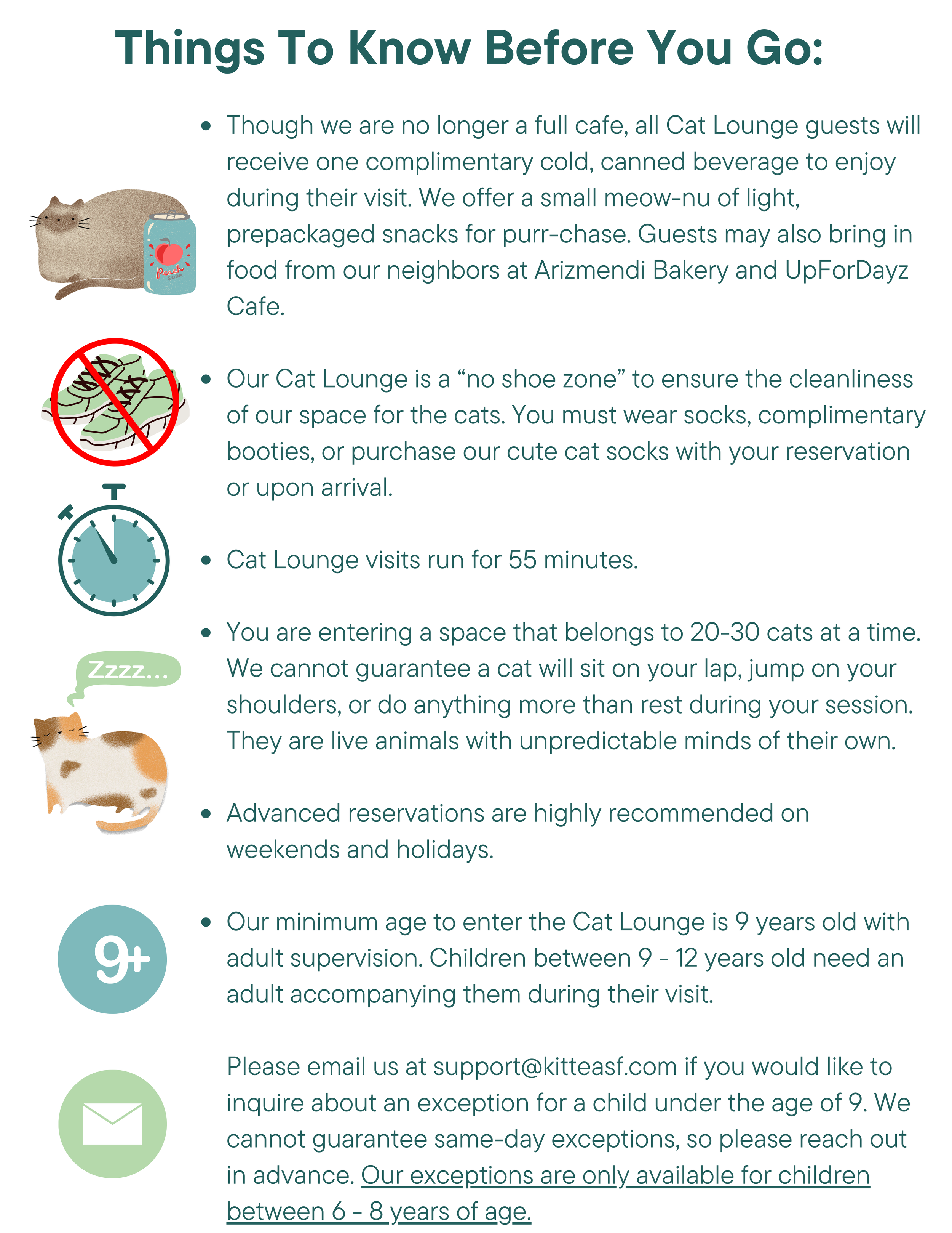We can only allow children 9 years and older to enjoy our cat lounge, however we can accommodate younger children if the entire family is booking out our cat lounge, or if it is a Purrivate Event booking. At least one adult (18+) needs to be present for every three children under 12 years. Please email us at support@kitteasf.com if you would like to inquire about an exception for a child under 9.